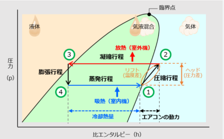 冷媒の状態変化を整理すると、次の4つの過程があるよ。