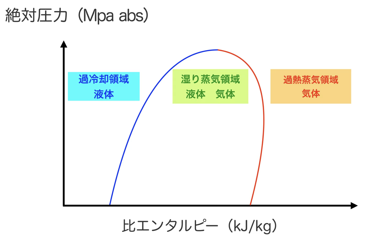 - 過熱領域:気体が飽和点以上で存在する領域です。比エンタルピーが高く、熱エネルギーが多く含まれています。