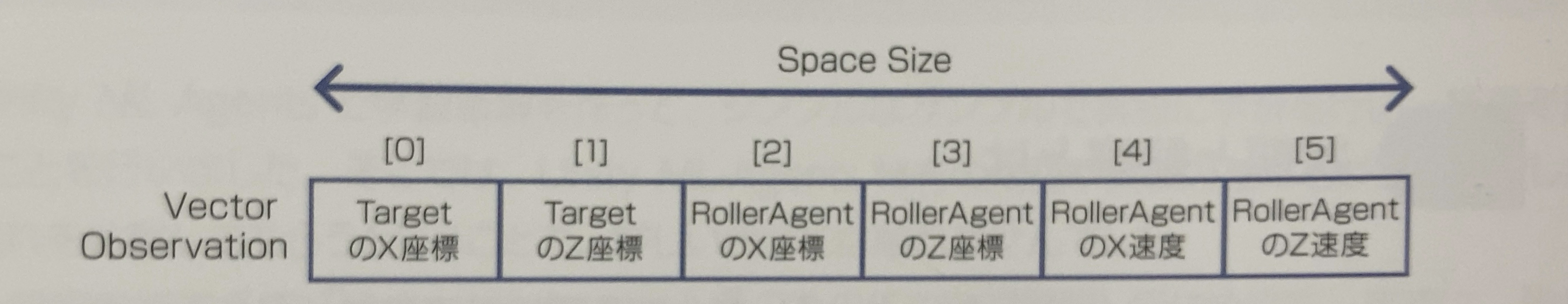 「Vector Observation」では、問題解決に必要な情報(位置や速度)を格納した配列を「観察」として利用します。