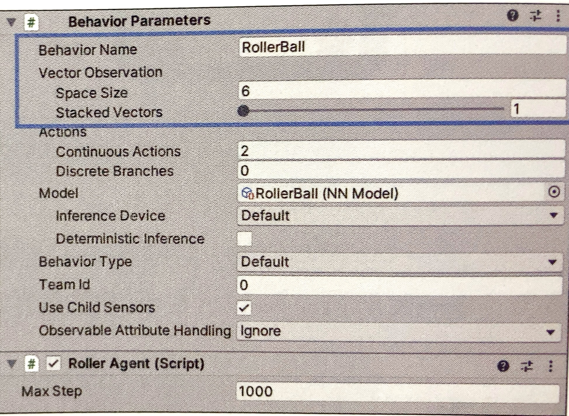「Unity ML-Agents」の基本データ型(浮動小数配列)の「観察」は、「Behavior Parameters」の「Vector Observation」で設定します。 それ以外にも各種センサーを使って、画像やレイキャストなど別形式の情報を「観察」として使用できます。
