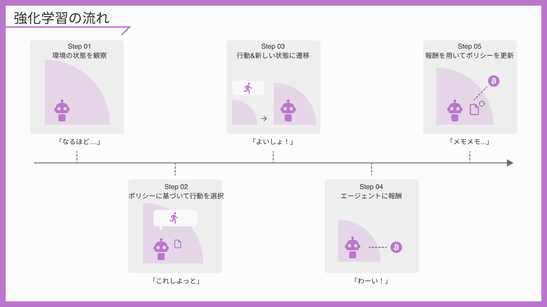 「強化学習」では、エージェントは環境を観 察して「状態」を取得し、その「状態」に応じて「ポリシー」が「行動」を決定します。
