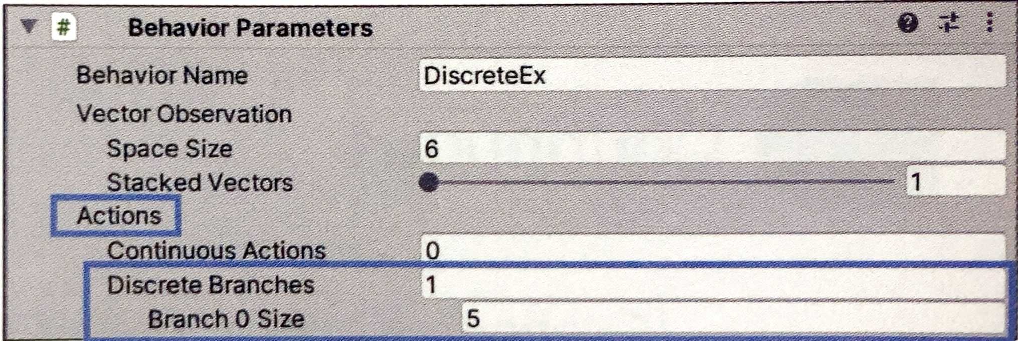| Actions → DiscreteBranches → Branch X Size | X番目の行動の値の範囲(0 ~ 設定値範囲) |