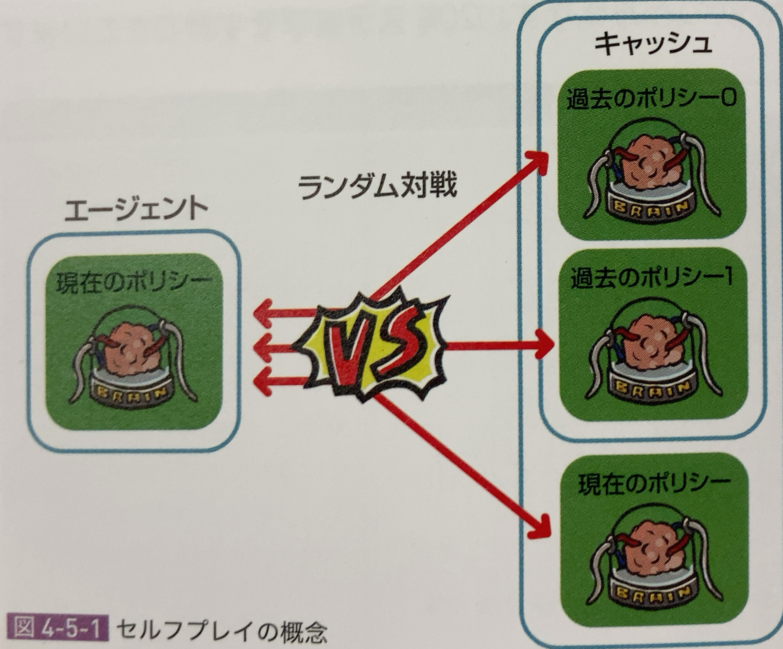 「セルフプレイ」は、「現在のポリシー」およびキャッシュした複数の「過去のポリシー」とランダム対戦することで学習します。